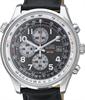 Citizen chronograph watch with Eco-drive movement. Sliding E6b ruler inner bezel. 100m water resistant. Large 45mm steel case with leather band