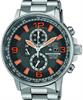 Citizen Men`s Eco-Drive Nighthawk Titanium Chronograph watch with orange/black dial, titanium case and bracelet. Quartz chronograph movement with date and 24-hour hand. 200 meters water resistant.