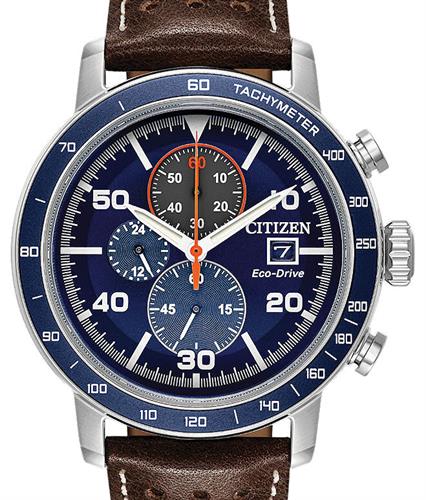 Citizen Brycen Eco-Drive Chronograph watch. Model CA0648-09L. Blue dial and bezel, stainless steel case, brown leather strap. Quartz chronograph movement with date and 24-hour hand.