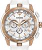 Victoria Azarenka Limited Edition Ecosphere Chronograph watch by Citizen. Eco-Drive movement. White textured dial. Rose gold-tone stainless steel case with white chroma-finish. White rubber strap. Quartz chronograph movement with date and 24-hour hand. 100 meters water resistant.