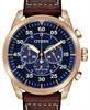 Citizen Avion Eco-Drive wrist watch with CITIZEN Rechargeable by light Eco-Drive Quartz chronograph movement. Blue dial with 24-hour hand, Arabic numerals and luminous hands. Rose gold plated stainless steel case, brown leather band.