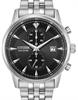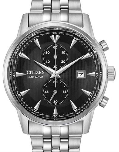 Citizen Men`s Eco-Drive Corso Chronograph watch with black textured dial, steel case and bracelet. Quartz chronograph movement with date.