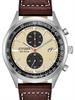 Citizen Men`s Eco-Drive Chandler Chronograph watch with ivory dial and black sub-dials, steel case, brown leather strap. Quartz chronograph movement with date.