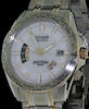 Citizen Eco-Drive radio controlled (from multi-band atomic clocks) perpetual calendar CB0006-51A. Travel friendly, pull crown out half way and change cities. White textured photocell dial. Applied rose gold markers with luminous fill. 200m water resistant. Stainless steel case and bracelet with rose gold color accents, sapphire crystal.