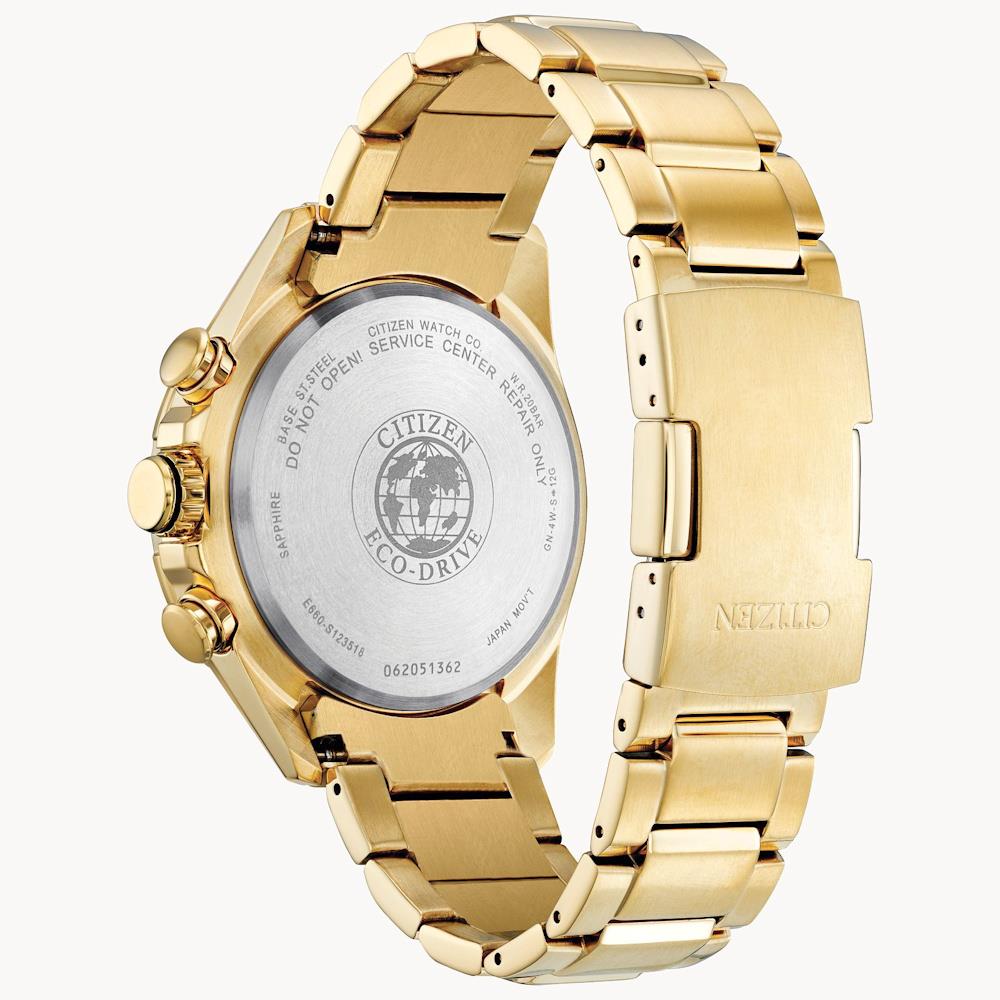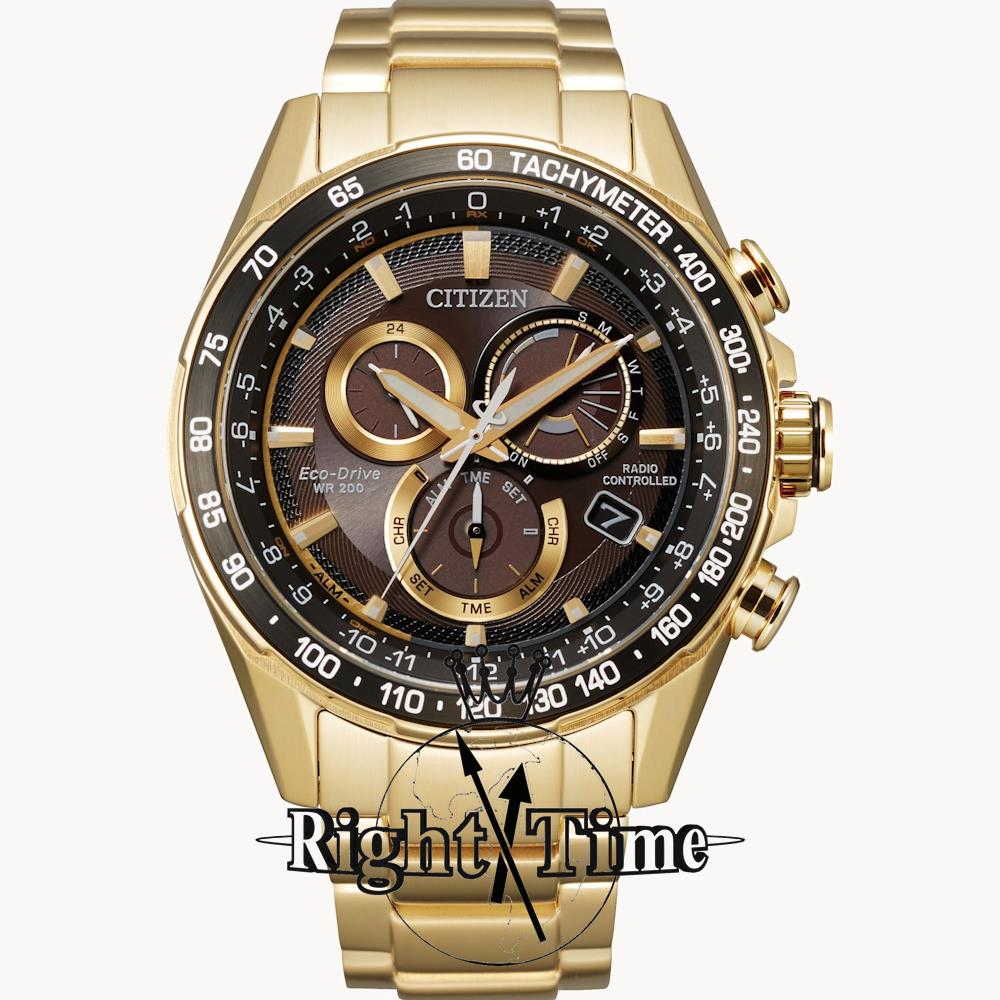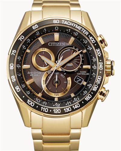 Citizen Men`s Eco-Drive Perpetual Chronograph PCAT model CB5912-50E. Radio Controlled Chronograph watch with brown dial, stainless steel gold plated case and bracelet. Quartz chronograph movement with date and 24-hour hand. 200 meters water resistant.