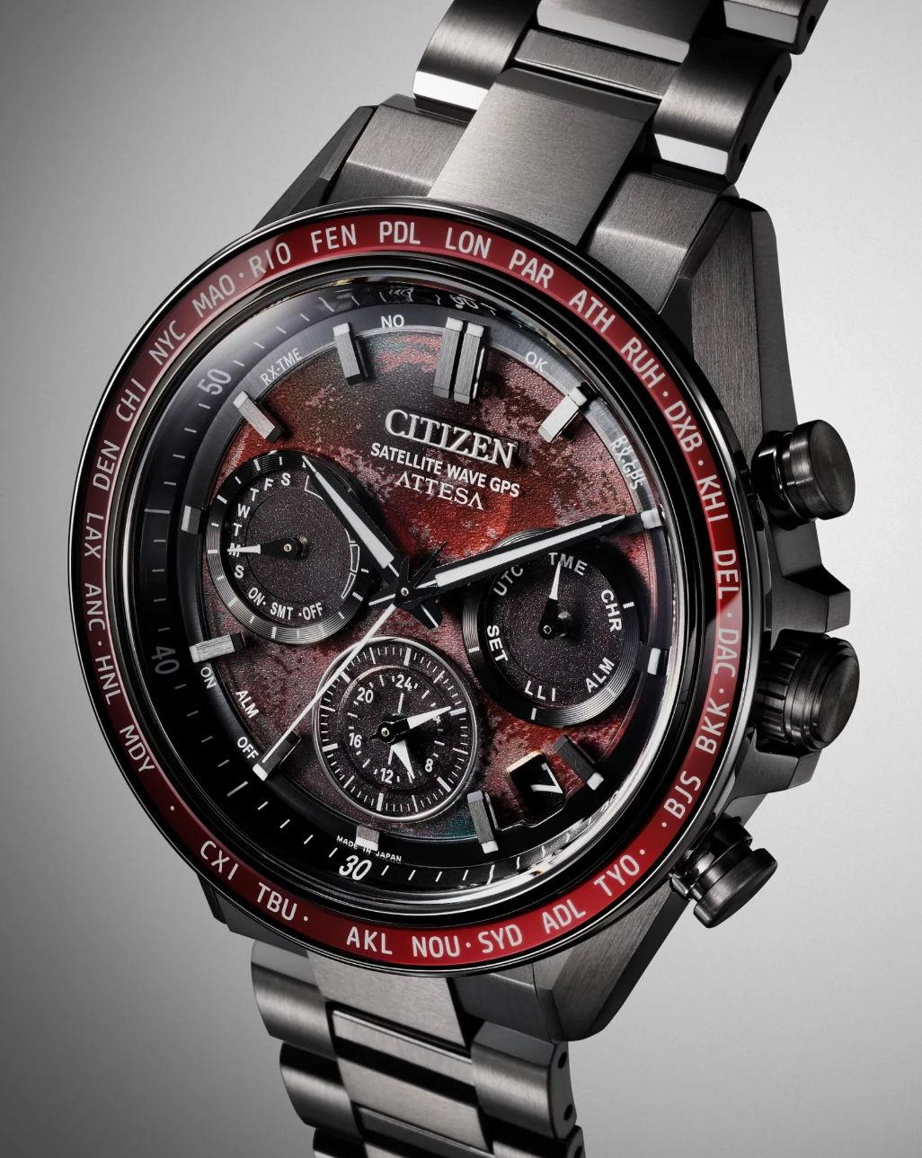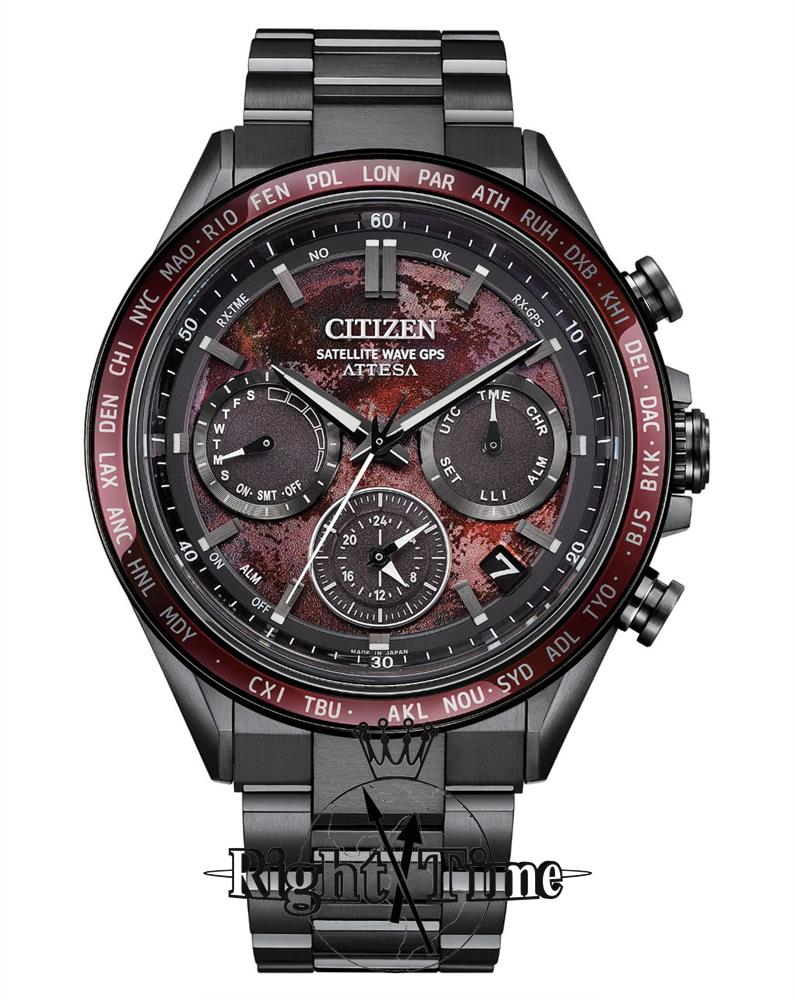 Citizen Attesa Red Super Titanium with Satellite Timekeeping model CC4077-71Z. Eco-drive solar powered movement with Satellite GPS Timekeeping System with Worldwide Reception Area. Super titanium case and bracelet. Anti-glare treated sapphire crystal. Red textured dial inspired by the deep crimson hues of a total lunar eclipse. Water resistant to 100 meters.