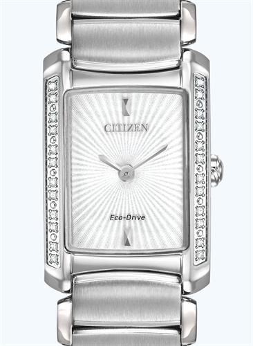 Citizen Euphoria EG2960-57A ladies wrist watch with diamonds on the bezel. Stainless steel case and bracelet. White textured dial.