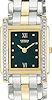 Citizen Stiletto Eco-drive sport style watch for Ladies. Polished and satin finished rectangular stainless steel case and watch bracelet with gold plated accents, diamonds on the bezel, black dial with gilt color markers.
