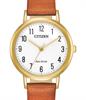 Citizen ladies dress model from Chandler Collection. Powered by quartz movement that never needs a battery - it runs on light! Gold plated steel case with brown leather strap. White dial with Arabic numerals.