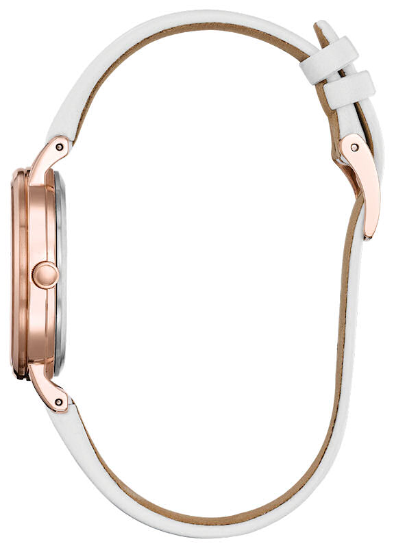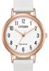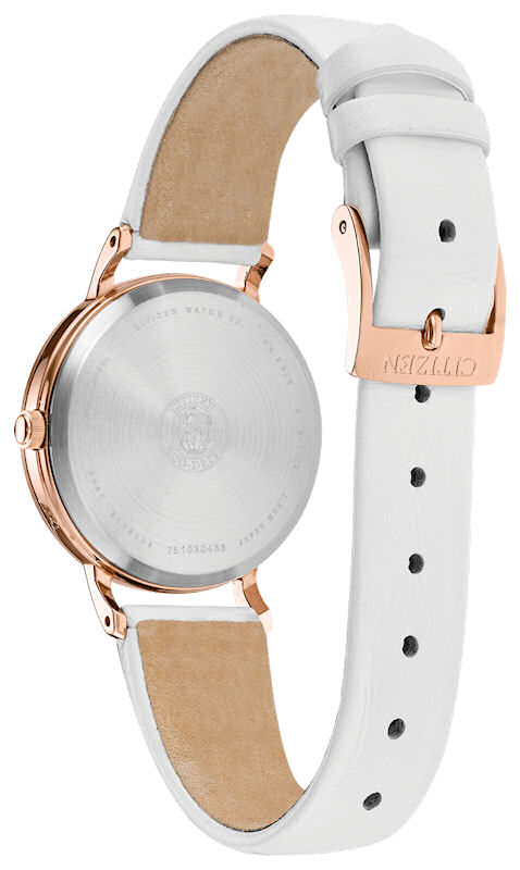Citizen ladies dress model from Chandler Collection. Powered by quartz movement that never needs a battery - it runs on light! Rose gold plated steel case with white leather strap. White dial with Arabic numerals.