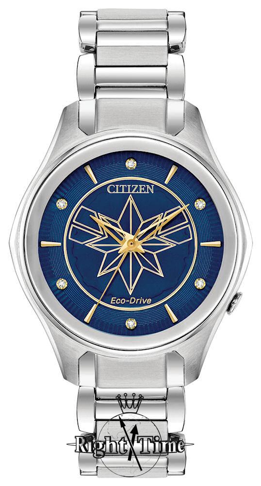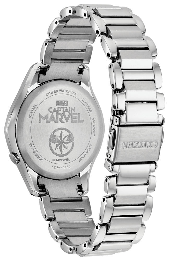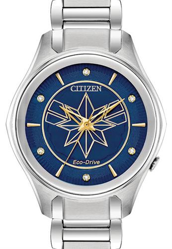 Citizen ladies Captain Marvel watch Model EM0596-58W. Features the recognizable gold star of the most powerful Super Hero in the Universe - Captain Marvel. Watch comes in stainless steel case with bracelet and navy dial. Powered by quartz movement that never needs a battery - it runs on light!