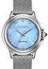 Citizen ladies dress model EM0790-55N from Ceci Collection. Powered by quartz movement that never needs a battery - it runs on light! Steel case with mesh bracelet. Blue Mother-of-Pearl dial with diamond markers.