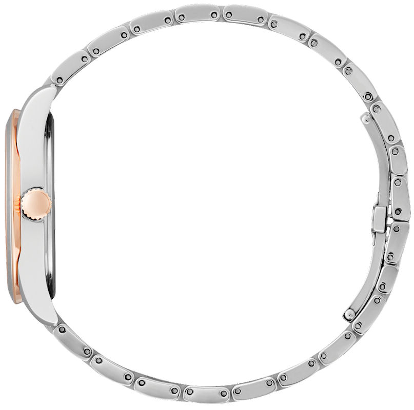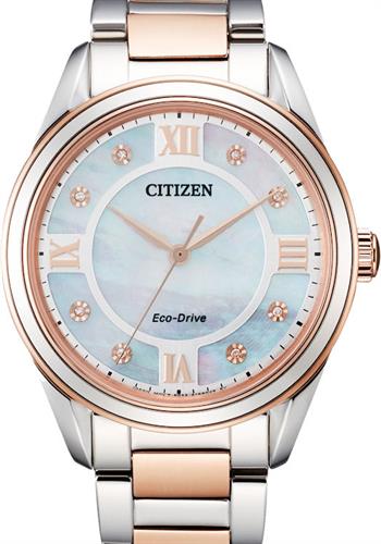 Citizen ladies dress model EM0876-51D from Arezzo Collection. Powered by quartz movement that never needs a battery - it runs on light! Steel case with bracelet and rose gold tone accents. Mother-of-Pearl dial with Roman and diamond markers.