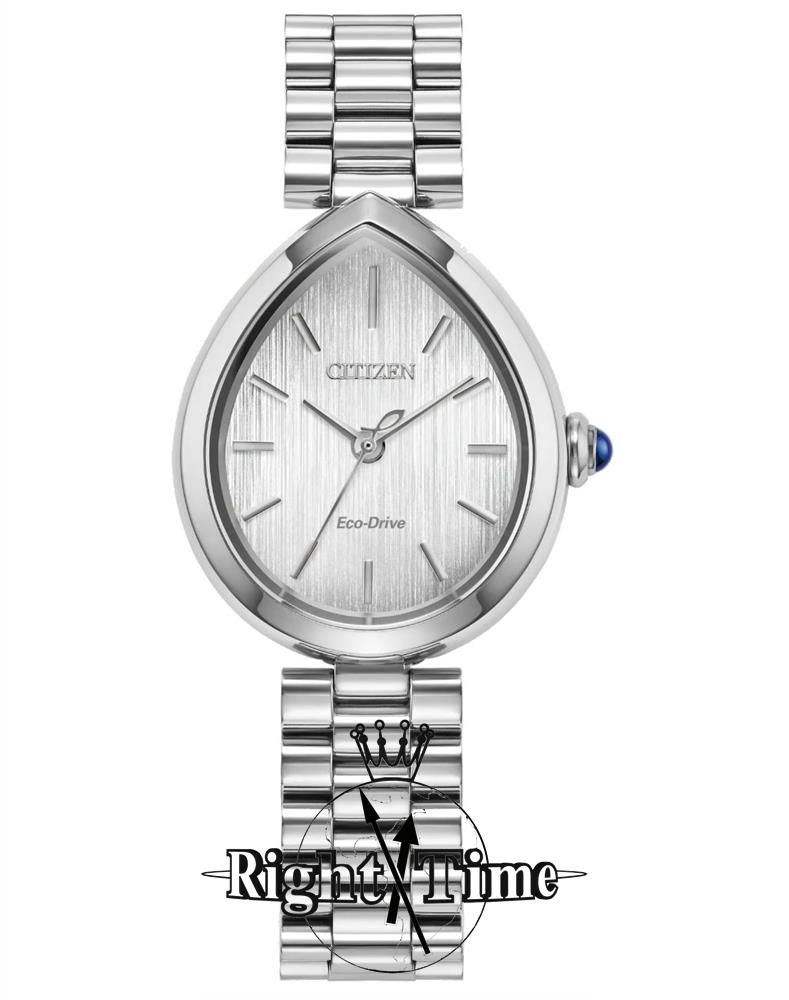 Citizen L Rainell ladies wrist watch. Model EM1200-55A. Eco-drive movement. Stainless steel case shaped as a raindrop. Silver tone dial. Sapphire crystal. 50 meters water resistant. Comes on a bracelet