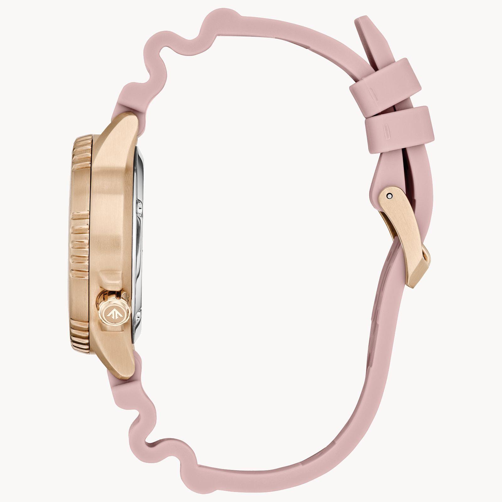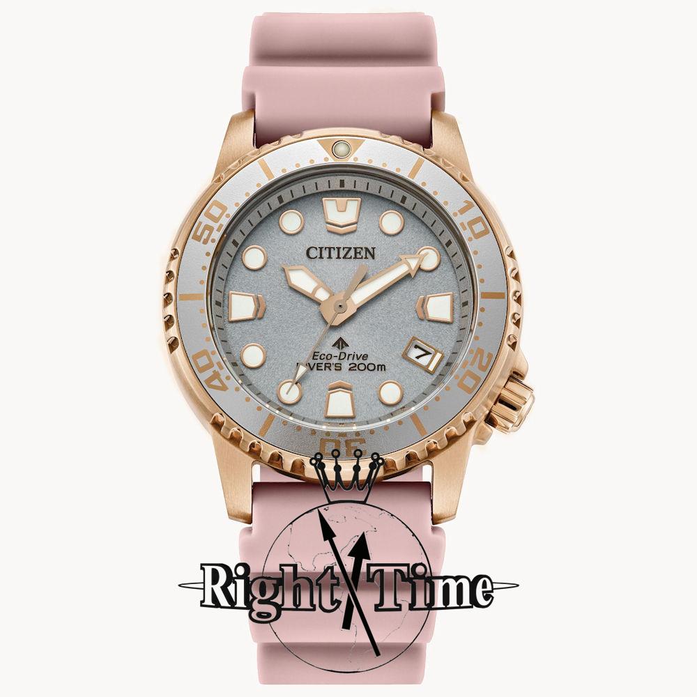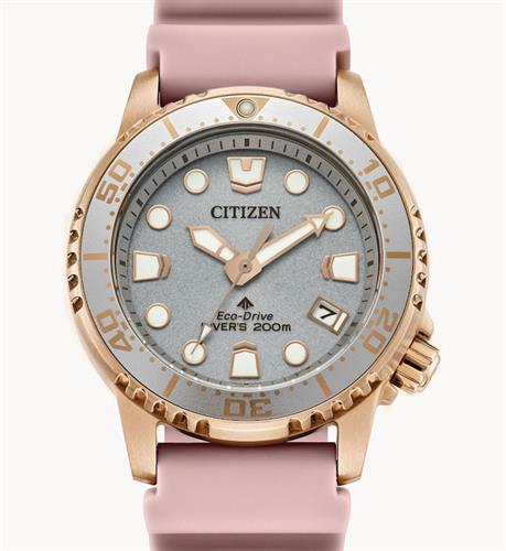 Citizen EO2023-00A Professional Diver wrist watch. 36.5mm size case, CITIZEN Rechargeable by light Eco-Drive Quartz movement with date calendar. Gold plated solid 316L Stainless steel case with uni-directional 0-60 bezel, screw-down crown, silver color dial with luminous hands and markers. 200m water resistance. Pink rubber watch band.