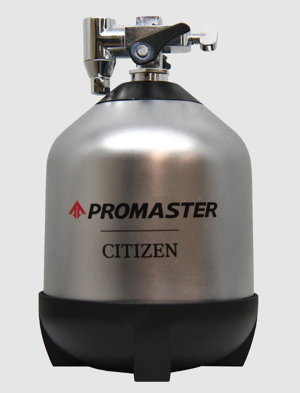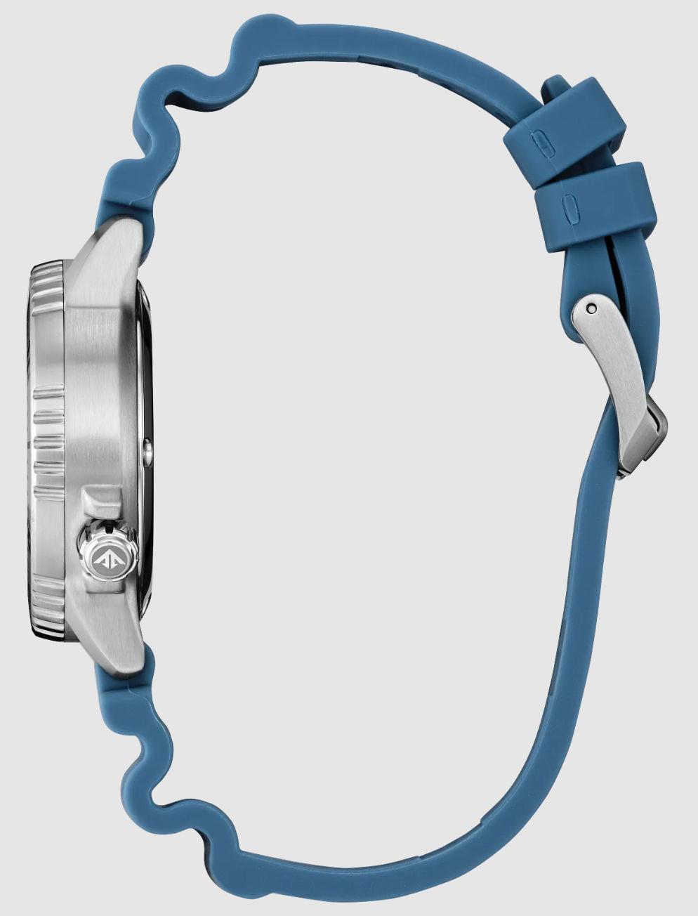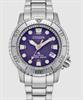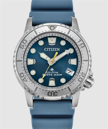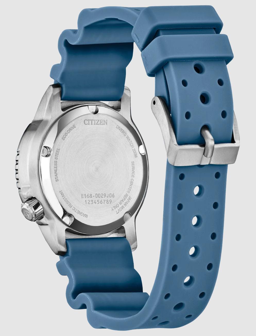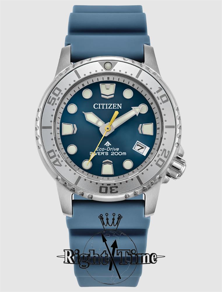 Citizen EO2027-09L Professional Diver wrist watch. 36.5mm size case, CITIZEN Rechargeable by light Eco-Drive Quartz movement with date calendar. Solid 316L Stainless steel case with uni-directional 0-60 bezel, screw-down crown, light blue color dial with luminous hands and markers. 200m water resistance. Light blue rubber watch band.