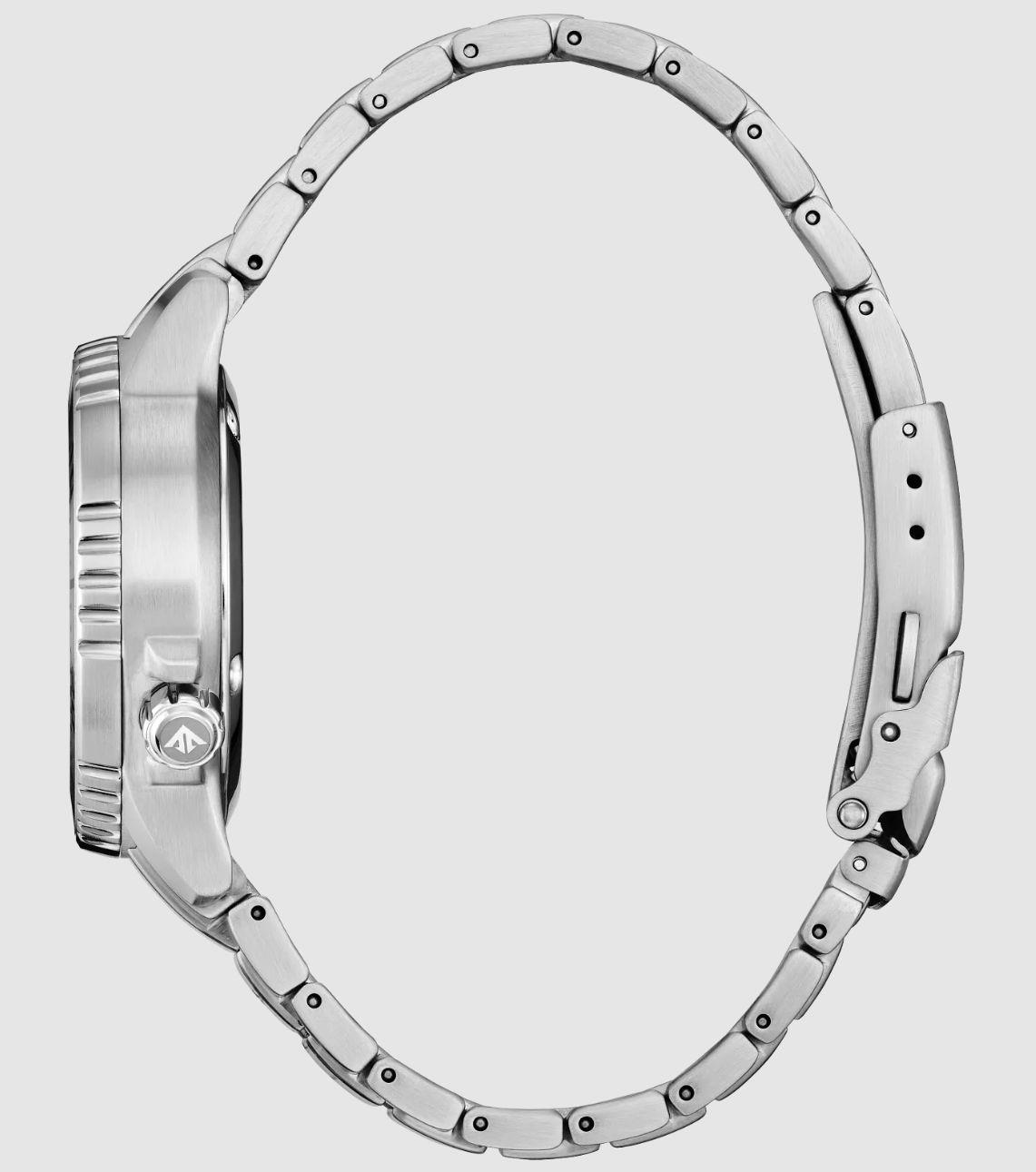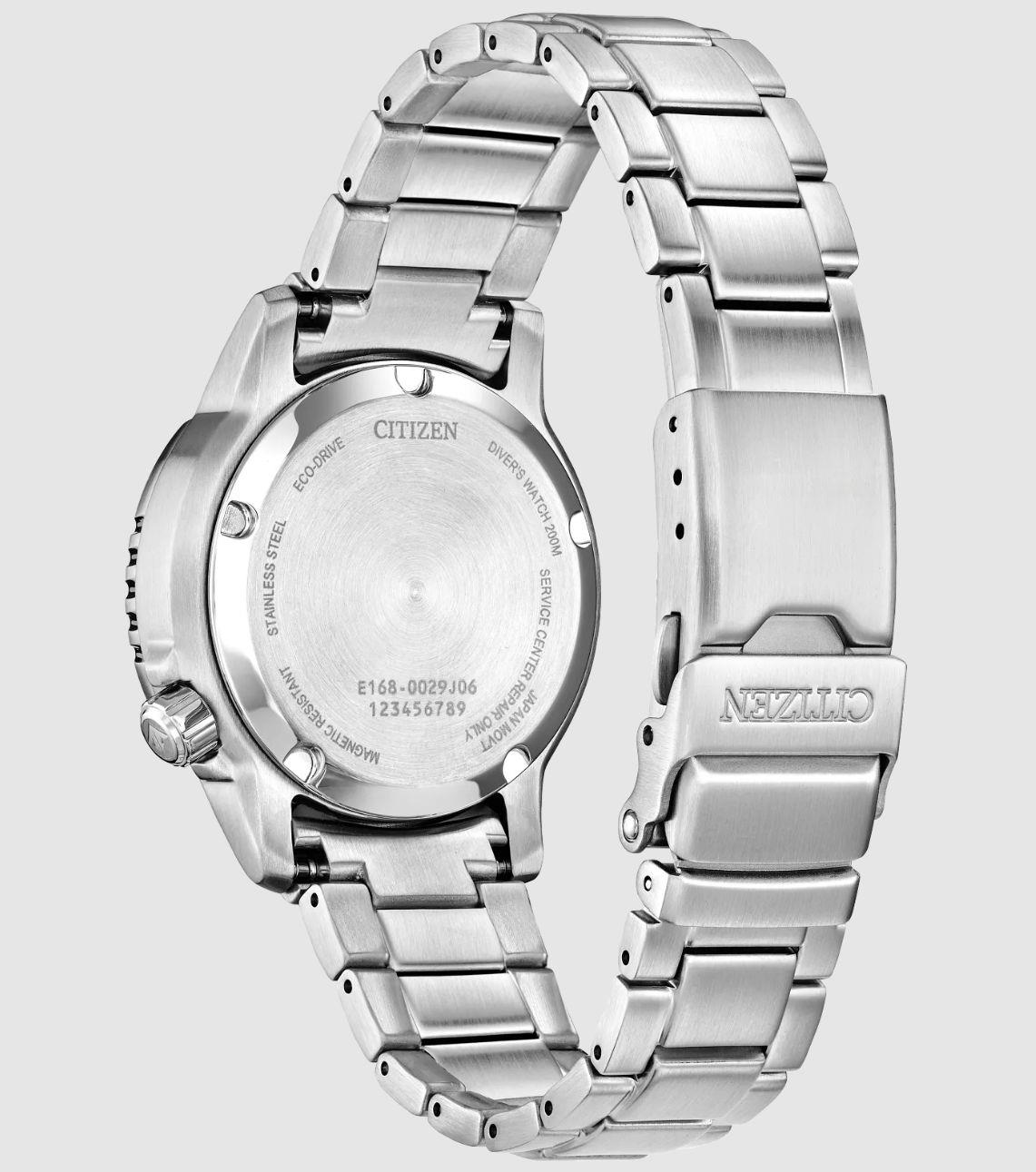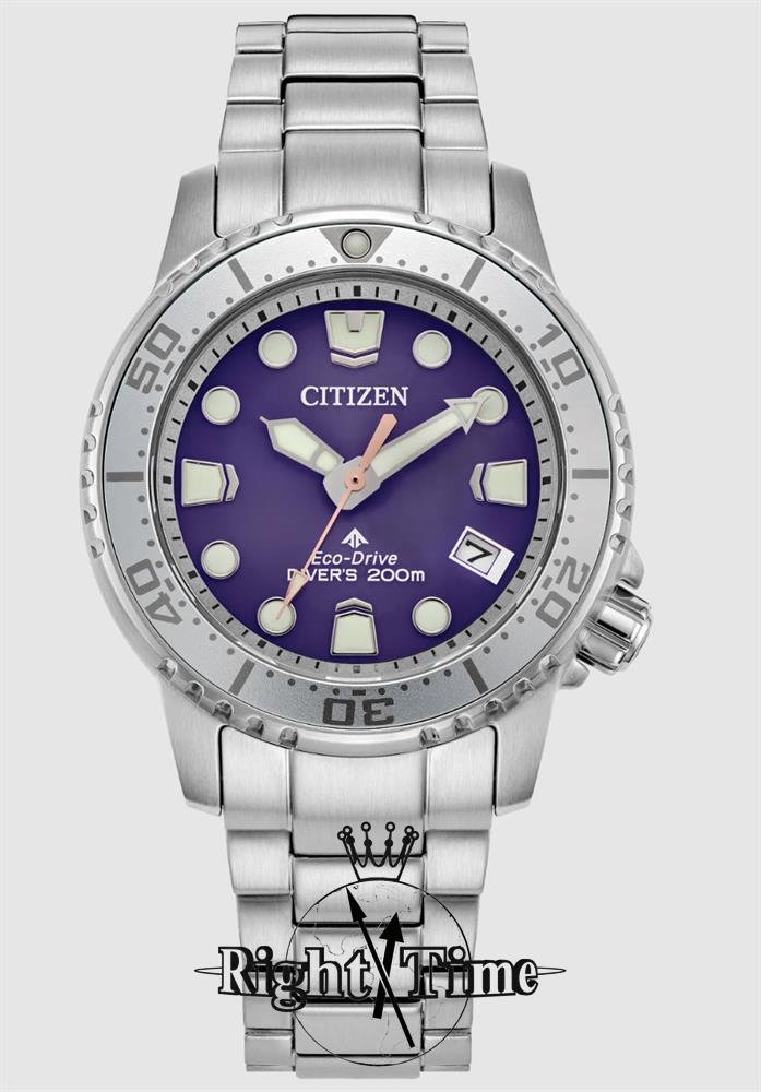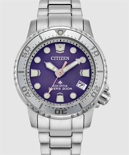 Citizen EO2027-50X Professional Diver wrist watch. 36.5mm size case, CITIZEN Rechargeable by light Eco-Drive Quartz movement with date calendar. Solid 316L Stainless steel case with uni-directional 0-60 bezel, screw-down crown, purple color dial with luminous hands and markers. 200m water resistance. Bracelet
