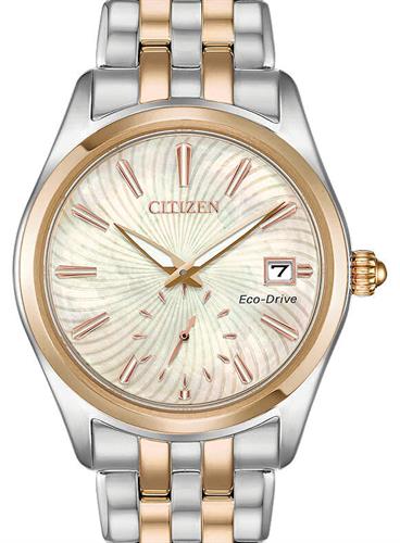 Citizen Corso ladies watch model EV1036-51Y. Rose gold tone accents on steel round case and bracelet. Powered by any light with Citizen Eco-Drive technology. Champagne Mother-of-Pearl "wavy" dial with date calendar, luminous hands and markers, small seconds sub-dial. Water resistant to 100 meters.