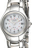 Citizen sport style Ladies wrist watch. Eco-drive movement with date. Stainless steel case and watch bracelet, white dial with Arabic numerals. 100 meters water resistant