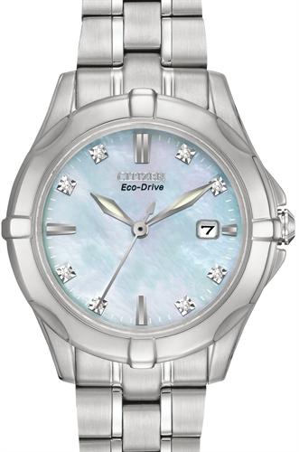 Citizen Ladies` Diamond Sport style wrist watch. Eco-drive movement with date. Stainless steel case and watch bracelet. Blue Mother-of-Pearl dial with 8 diamond markers. 100 meters water resistant