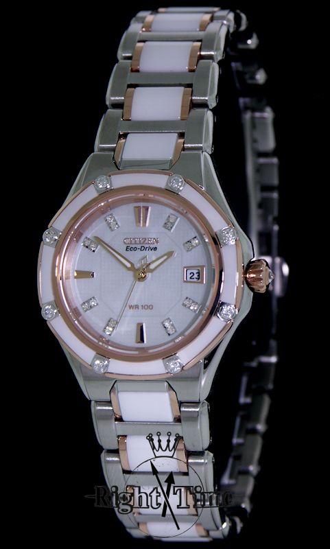 Octavia model for ladies from Citizen Signature. Solid stainless steel case with a white ceramic and diamond bezel and rose gold plated accents. On a highly polished and satin finish stainless steel bracelet with smooth white scratch resistant ceramic inserts, also featuring subtle rose gold plated accents. Diamond on the crown. White mother of pearl dial with diamond markers.