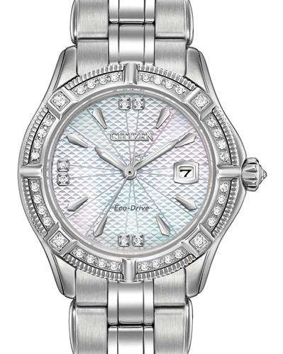 Citizen Arezzo Eco-Drive Sport ladies size watch. Steel case and watch bracelet. Diamonds on the bezel. White textured dial with date calendar. 100 meters water resistant