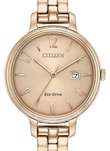 Citizen Eco-Drive Sport ladies size watch from Citizen Chandler Collection. Rose gold plated steel case and watch bracelet. Rose gold tone dial with date calendar. 50 meters water resistant