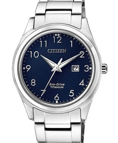 Citizen Eco-Drive ladies size watch. Titanium case and watch bracelet. Blue color dial with date calendar and Arabic numerals.