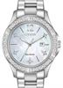 Citizen Eco-Drive ladies size watch from Citizen Elektra Collection. Stainless steel case and watch bracelet. Diamond bezel. White Mother-of-Pearl dial with date calendar and "twinkle star" diamond markers. 100 meters water resistant
