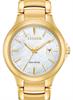 Citizen Eco-Drive ladies size watch from Citizen Chandler Collection. Gold plated stainless steel case and watch bracelet. White Mother-of-Pearl dial with date calendar. 50 meters water resistant