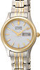 Citizen Ladies wrist watch. Eco-drive movement with day/date. Stainless steel case with gold plated accents. White color dial. Flexible expansion band.