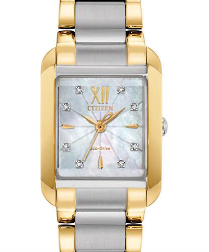 Citizen Bianca Collection model EW5554-58D. Ladies wrist watch. Eco-drive movement. Gold plated 2-tone stainless steel tank style case with watch bracelet, white Mother-of-Pearl dial with diamond markers, sapphire crystal. 50 meters water resistant