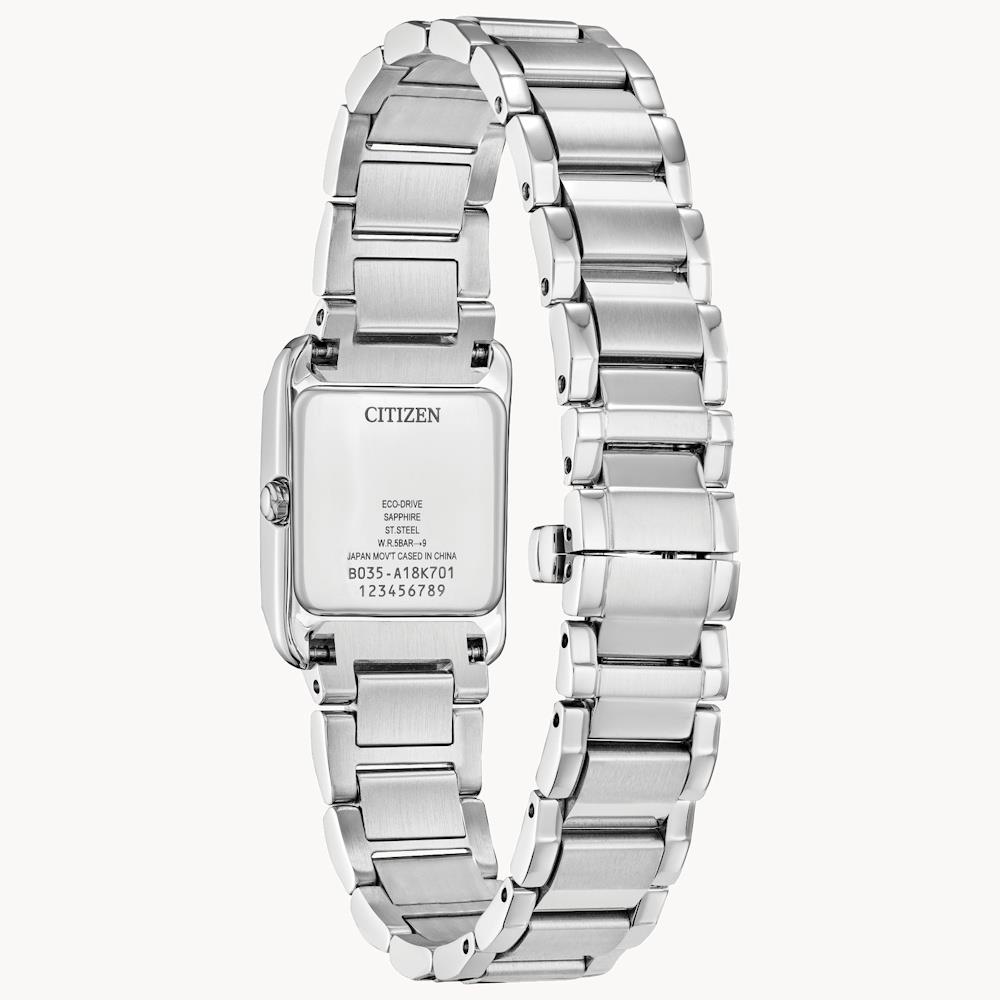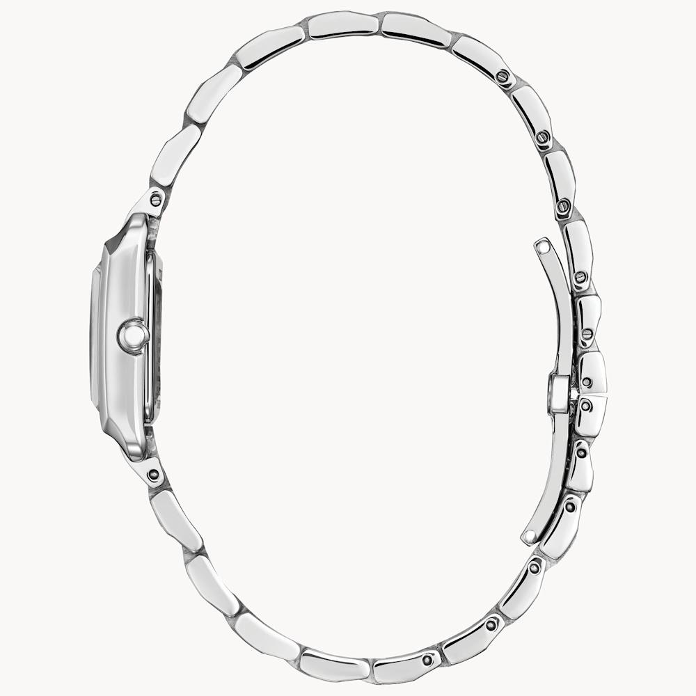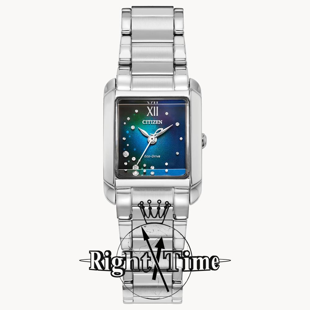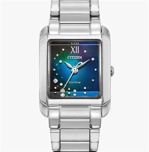 Citizen Bianca Collection model EW5591-51L. Ladies wrist watch. Eco-drive movement. Stainless steel tank style case with watch bracelet, sapphire crystal. The color gradient on the dial spans the deepest blues of the ocean floor to lighter shades of blue on the surface, with diamonds and precision-cut decorations reminiscent of bubbles rising to the surface. 50 meters water resistant