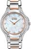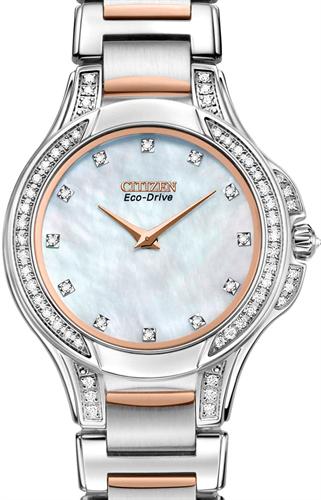 Citizen Signature eco-drive stainless steel watch with Mother of Pearl dial with 65 hand-set diamonds on dial, bezel, and case lugs. Rose gold plated accents. Convenient deployment buckle. Powered by light - does not need batteries. Five year factory warranty.