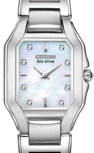 Citizen Signature ladies EX1190-58D model. Citizen quartz Eco-Drive movement powered by light. Rectangular solid stainless steel case on a stainless steel bracelet. Genuine white mother-of-pearl dial with diamond markers.