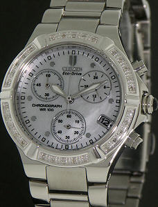 Citizen sport style Ladies wrist watch from Citizen Riva collection. Eco-drive movement with chronograph and date. Stainless steel case and watch bracelet, decorated bezel with diamonds, silver color Mother-of-Pearl dial. 100 meters water resistant