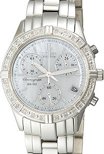 Citizen Miramar Ladies Diamond sport chronograph wrist watch. Eco-drive chronograph movement with date. Stainless steel case and watch bracelet, Mother-of-Pearl dial, sapphire crystal. Diamonds on the bezel. 100 meters water resistant