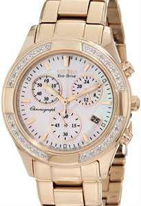 Citizen Regent ladies watch with diamonds on the bezel. Quartz chronograph movement. Steel case gold plated and bracelet. Mother-of-Pearl dial. 100 meters water resistant.