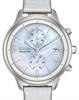 Citizen Ladies` Chronograph wrist watch. Eco-drive movement with date. Stainless steel case with silver color pearlized leather band. White Mother-of-Pearl dial. 50 meters water resistant