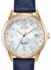Citizen Ladies` World Time wrist watch. Eco-drive movement. Watch features: world time functions in 26 times zones, perpetual calendar and date. Rose gold plated stainless steel case with blue leather band. White Mother-of-Pearl dial. 50 meters water resistant