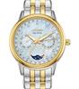 Citizen Calendrier Ladies wrist watch model FD0004-51D. Eco-drive movement. Stainless steel 2-tone case and watch bracelet. White Mother-of-Pearl dial with diamond markers, date calendar, day-of-week, month, and moon-phase indicators. 50 meters water resistant