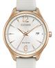 Citizen Chandler model FE6103-00A. Eco-Drive movement. Rose gold plated stainless steel case with white rubber strap. White color dial.