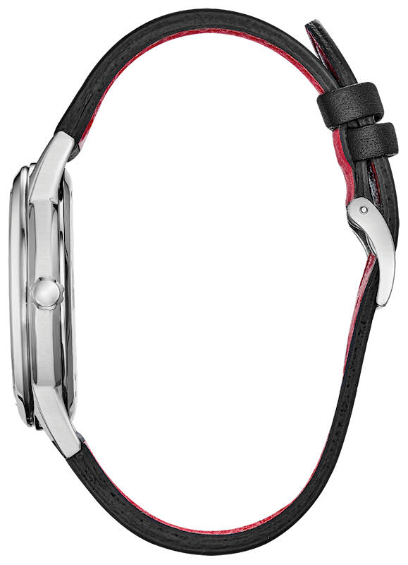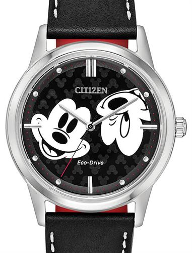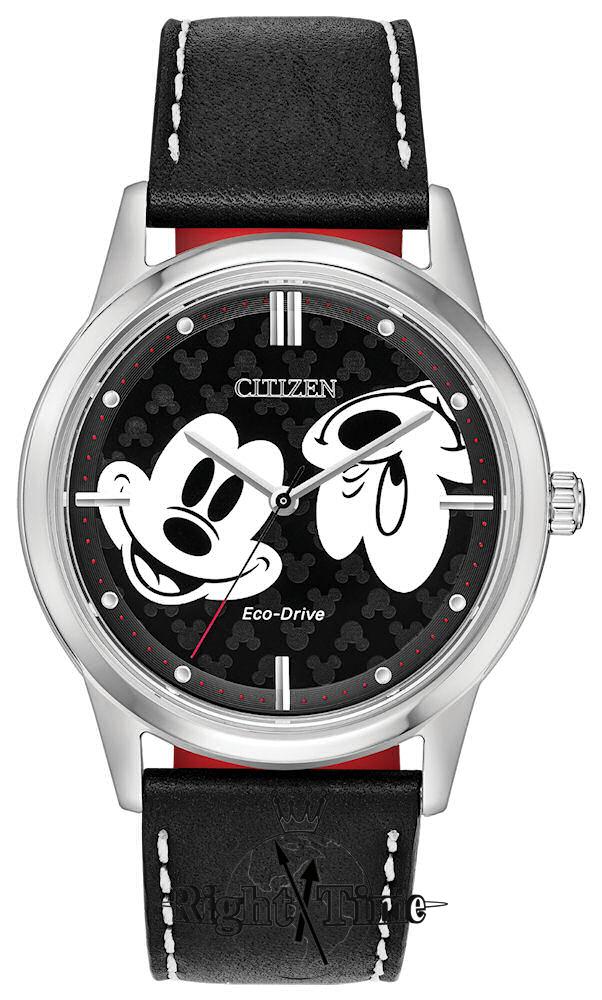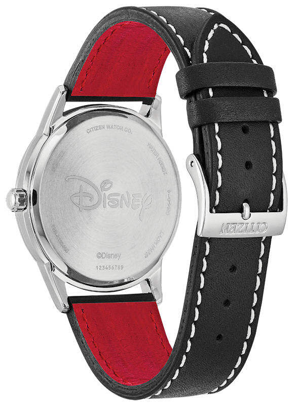 Citizen Disney Mickey Mouse watch model FE7060-05W. Powered by Eco-drive quartz movement. Stainless steel case with black leather band. Black and white dual MICKEY dial with red accents.