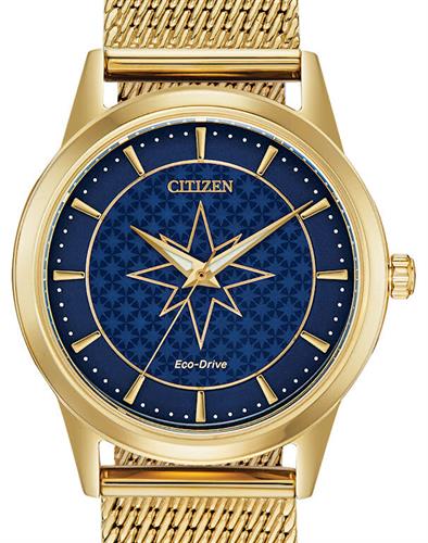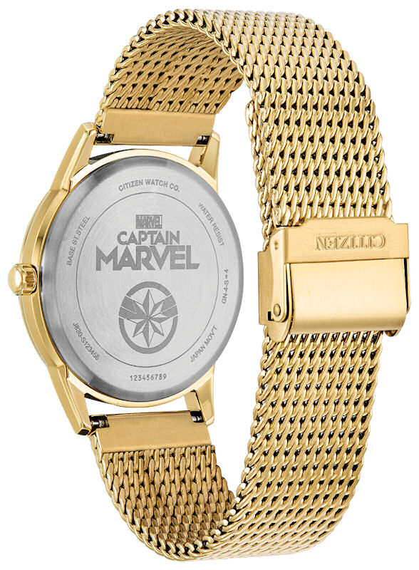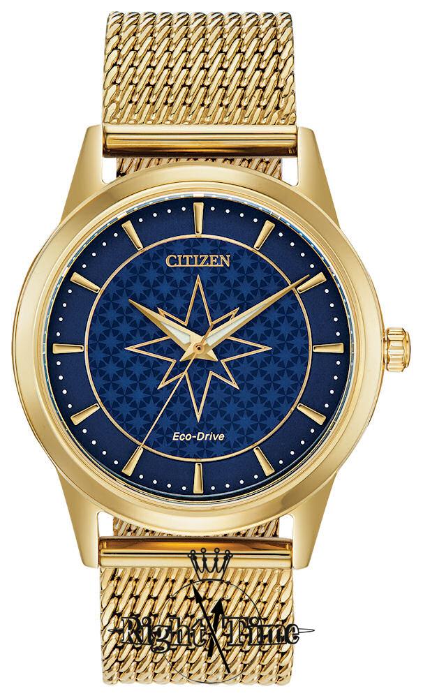 Citizen Captain Marvel watch model FE7062-51W. Powered by Eco-drive quartz movement. Gold plated stainless steel case and mesh style bracelet. Navy blue dial with gold-tone accent and Captain Marvel recognizable star