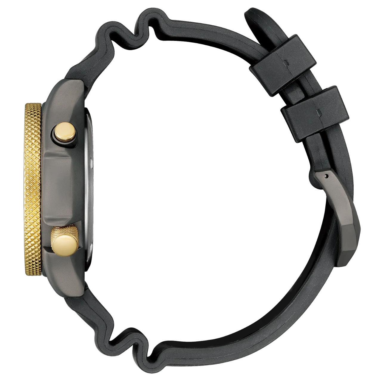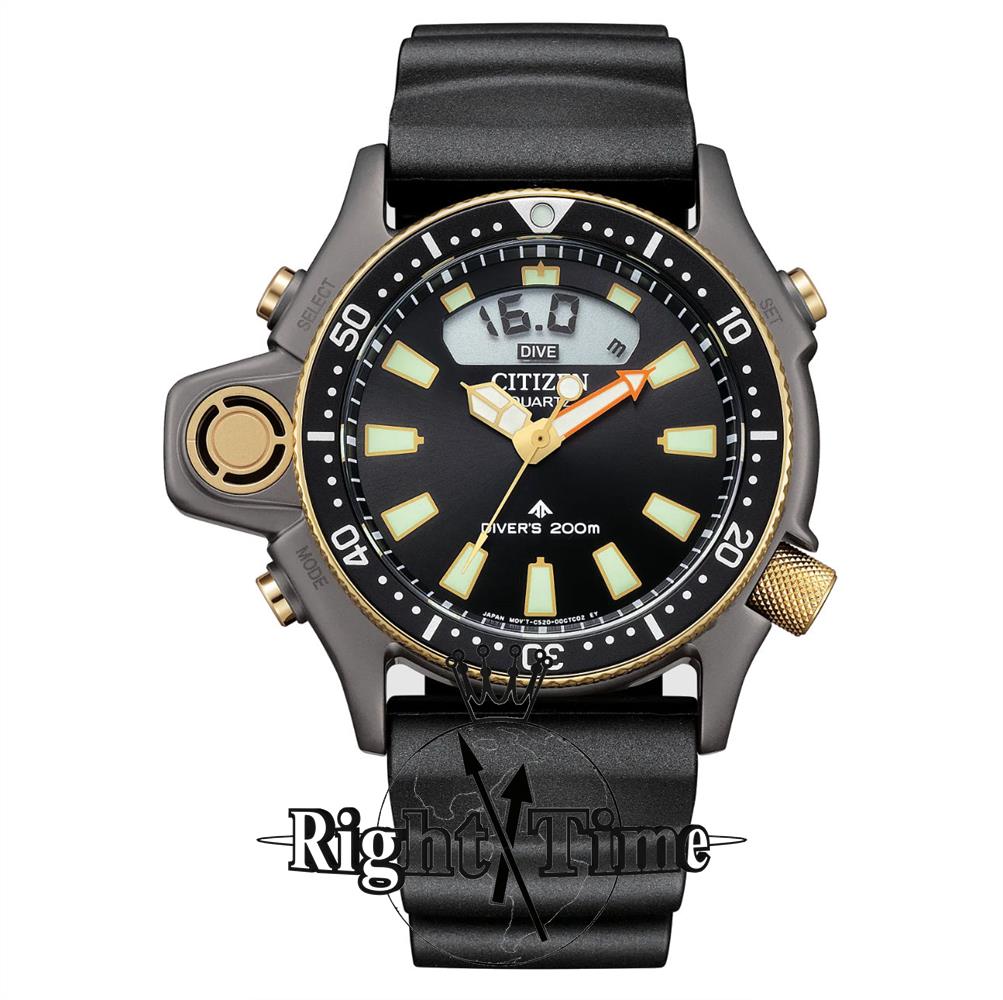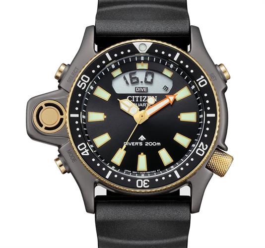Citizen Promaster Aqualand watch. Model JP2008-06E. Black dial, grey plated stainless steel case with gold tone accents and rubber strap. Watch features: calendar, 1/1000 second chronograph, analog/digital displays, underwater depth display up to 260 feet, alarm