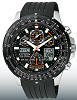 Citizen Eco-drive Skyhawk A-T Flight Chronograph model JY0000-02E. Watch Functions: Atomic Timekeeping with Radio Controlled Accuracy; Chronograph; 99 Minute Countdown Timer; Perpetual calendar; Analog/Digital Display; Time and calendar in 43 Cities; Two Alarms; Greenwich mean time display. Stainless steel case with E6B slide rule scale on black bezel. Black dial with luminous hands and markers. Black rubber watch band with tri-fold deployment clasp and spring release. 200m water resistant.