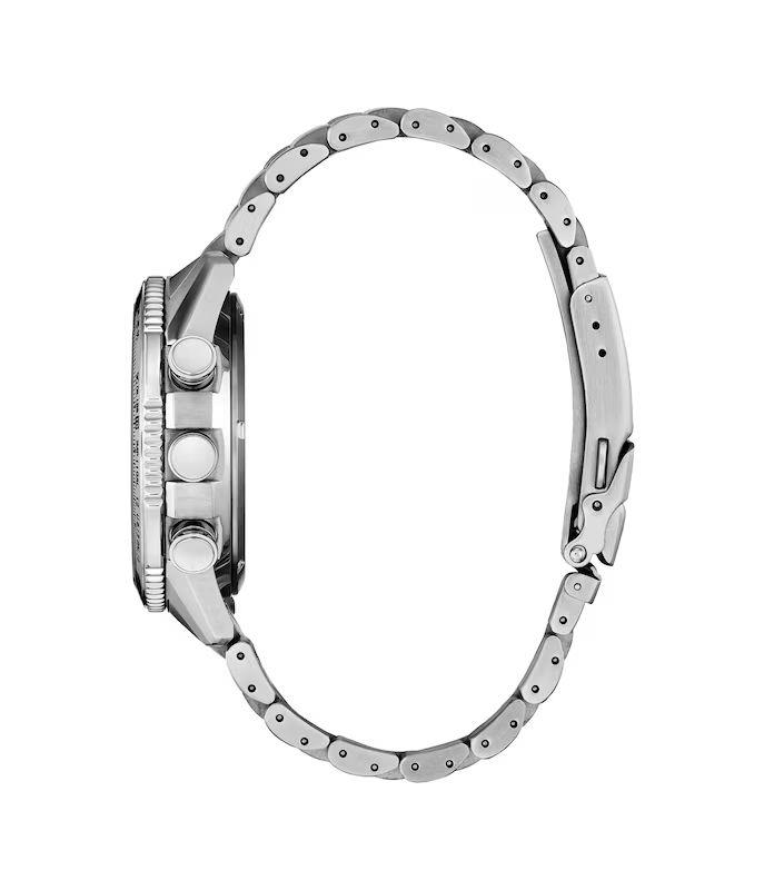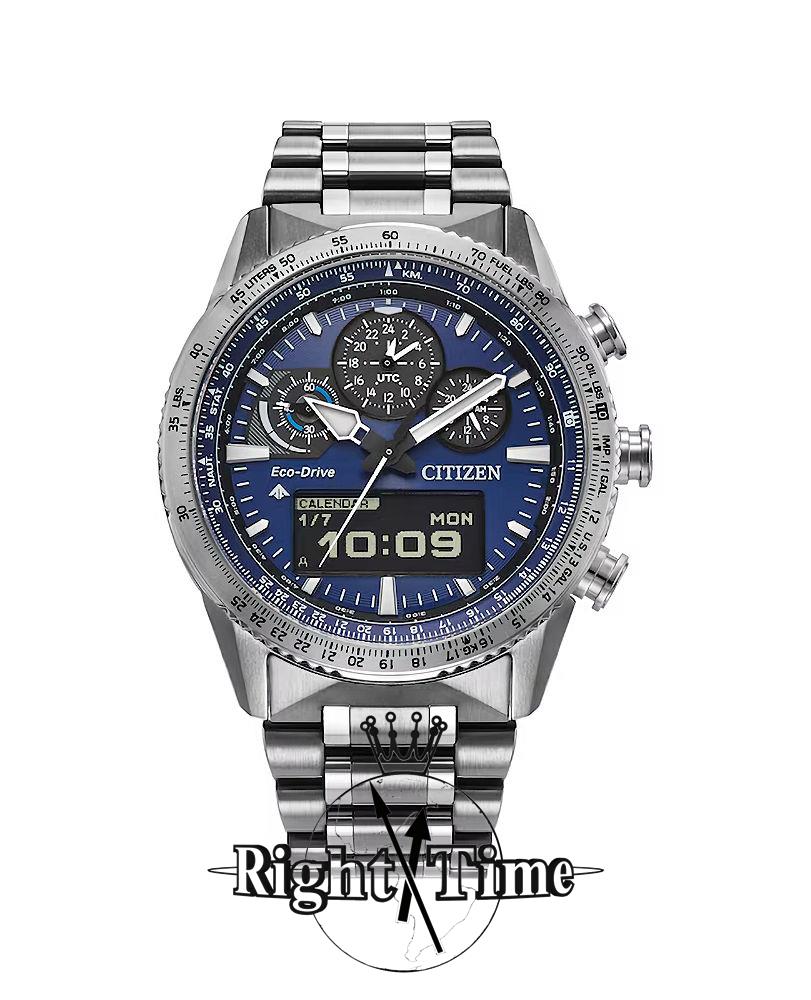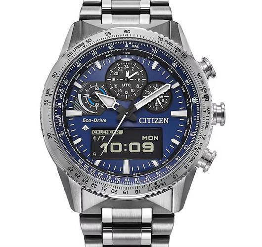 Citizen Promaster Skyhawk Analog-Digital Chronograph model JV2000-51L. Stainless steel case and bracelet. Blue dial features a combination of digital and analog displays. Watch functions include perpetual calendar, alarm, 1/100 second chronograph measuring up to 24 hours, and 99-minute countdown timer