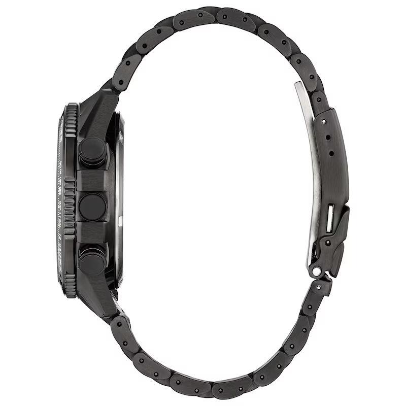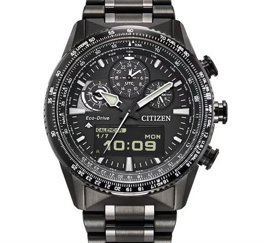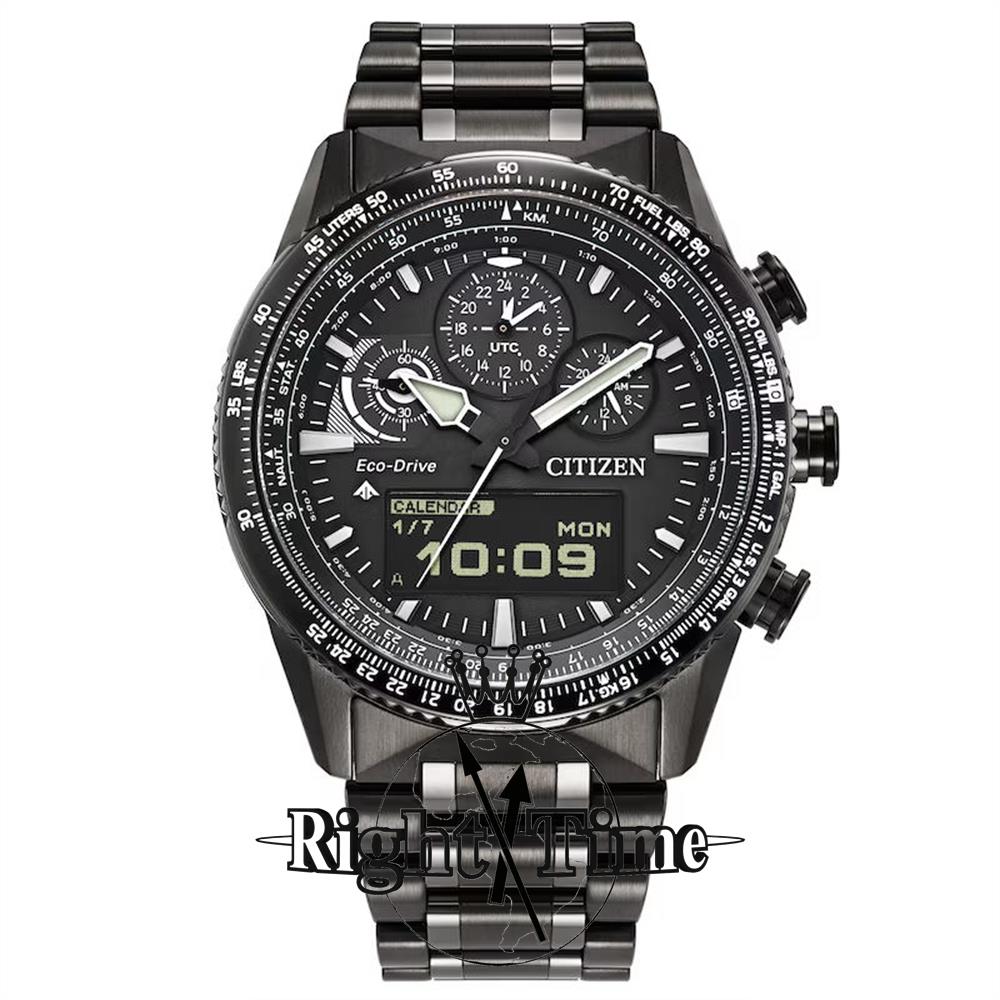 Citizen Promaster Skyhawk Analog-Digital Chronograph model JV2005-58E. Black PVD plated stainless steel case and bracelet. Black dial features a combination of digital and analog displays. Watch functions include perpetual calendar, alarm, 1/100 second chronograph measuring up to 24 hours, and 99-minute countdown timer