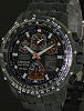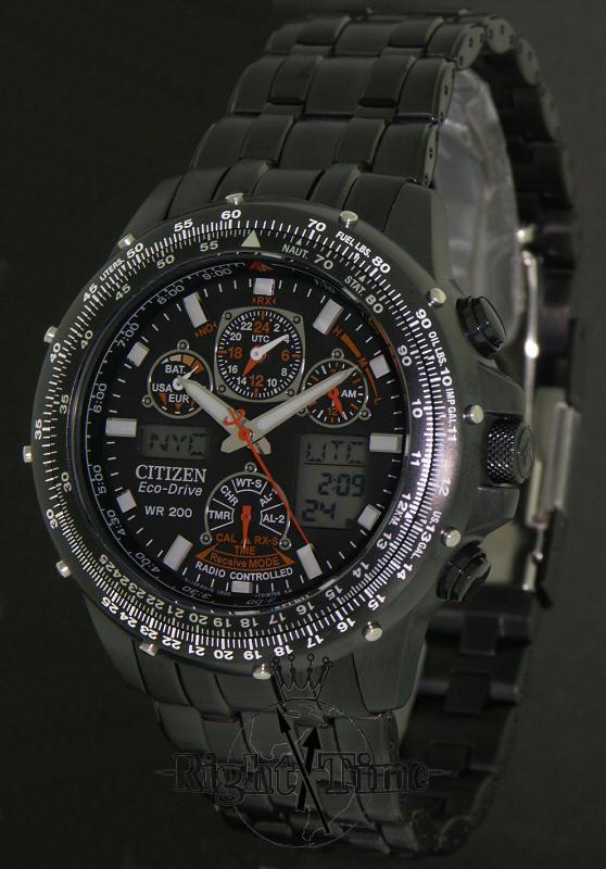 Citizen Eco-drive Skyhawk A-T Flight Chronograph model JV0005-50E. Watch Functions: Atomic Timekeeping with Radio Controlled Accuracy; Chronograph; 99 Minute Countdown Timer; Perpetual calendar; Analog/Digital Display; Time and calendar in 43 Cities; Two Alarms; Greenwich mean time display. Stainless steel black plated case with E6B slide rule scale on black bezel. Black dial with luminous hands and markers. Stainless steel black plated watch bracelet with tri-fold deployment clasp and spring release. 200m water resistant.