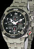 Citizen Eco-drive PROMASTER CARBON A-T Flight Chronograph model JV0075-54E. Watch Functions: Atomic Timekeeping with Radio Controlled Accuracy; Chronograph; World Time in 43 Cities; Two Alarms; 99 Minute Countdown Timer; Perpetual calendar; Analog/Digital Display; Greenwich mean time display; Power Reserve Indicator. Stainless steel case with one-way rotating carbon fiber bezel. Black dial with luminous hands and markers. Stainless steel watch bracelet with tri-fold deployment clasp and spring release. 200m water resistant.